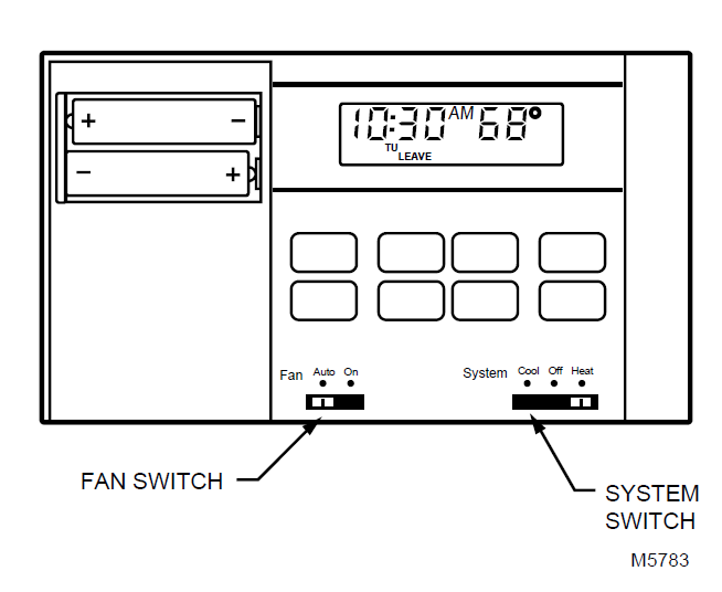 Batteries are required for operation and programming. When inserting batteries, set the system switch to OFF. Remove the battery door (on the thermostat’s left side) using a coin at the bottom. SeeMaintaining Your Thermostat section.