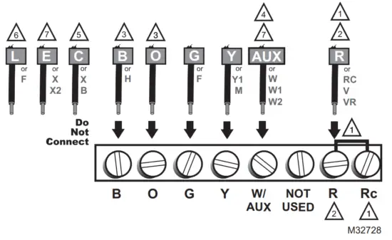 If labels do not match letters on the thermostat, check the chart below and connect to the terminal as shown here (see notes, below).