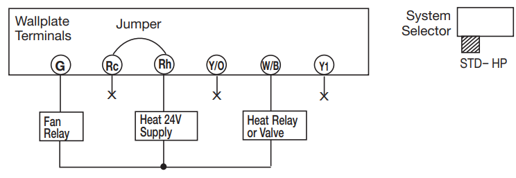 - There is often no ter-minal marking on the existing thermostat of two wire, heat only systems. Just connect either of the wires to the RH terminal, then connect the other wire to the W terminal to complete the circuit.