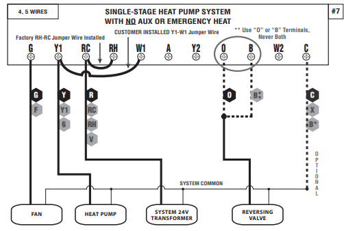 - For Heat Pump systems, you will use either the “O” terminal or the “B” terminal on this thermostat, but not both. If your old thermostat has both an “O” and a “B” wire present, then “B” is likely a System Common wire and may be connected to the “C” terminal. Connecting a System Common wire to this thermostat’s “B” terminal may damage the thermostat, and also your heating and cooling system.