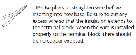 Use pliers to straighten the wire before inserting it into new base. Be sure to cut any excess wire so that the insulation extends to the terminal block. When the wire is installed properly to the terminal block, there should be no copper exposed.